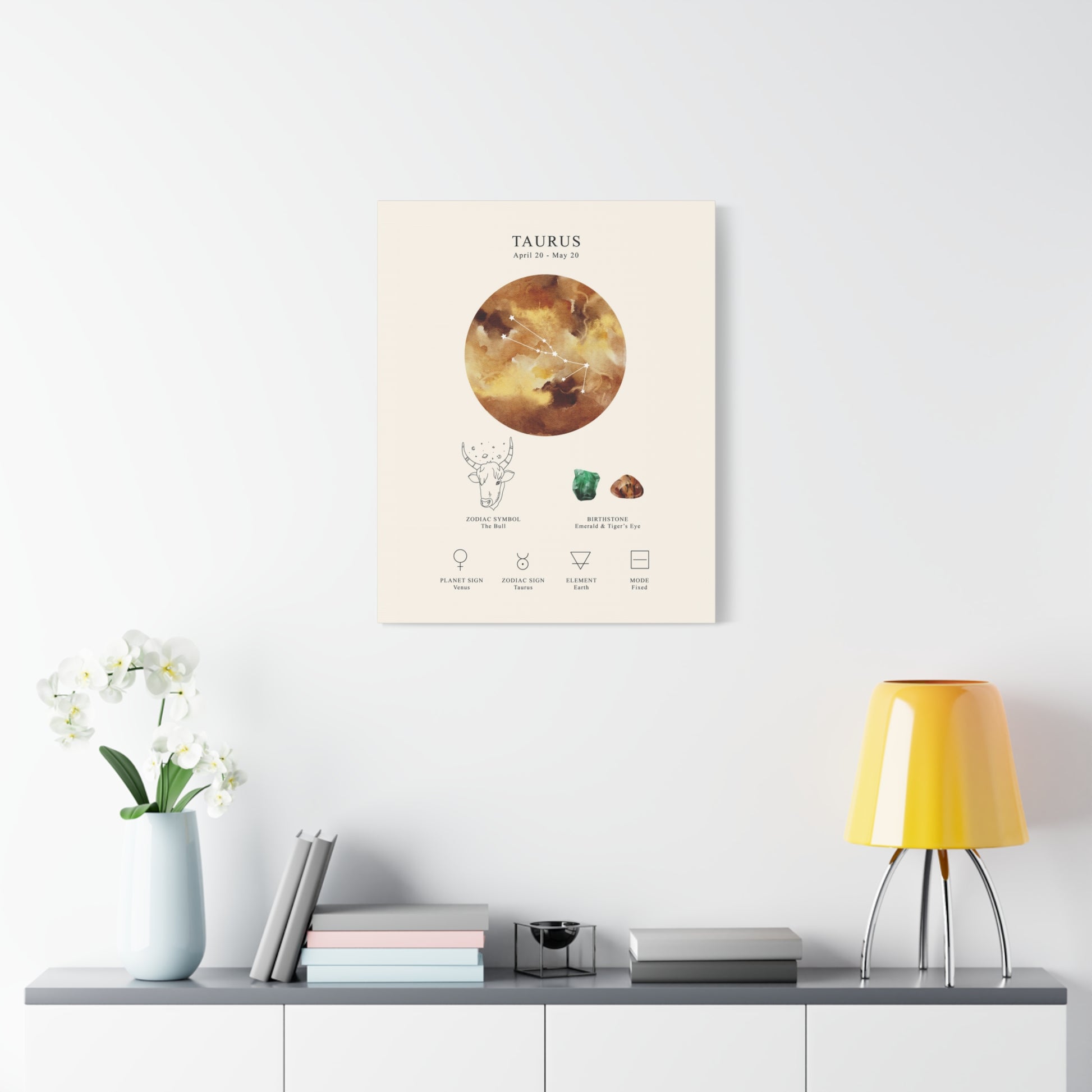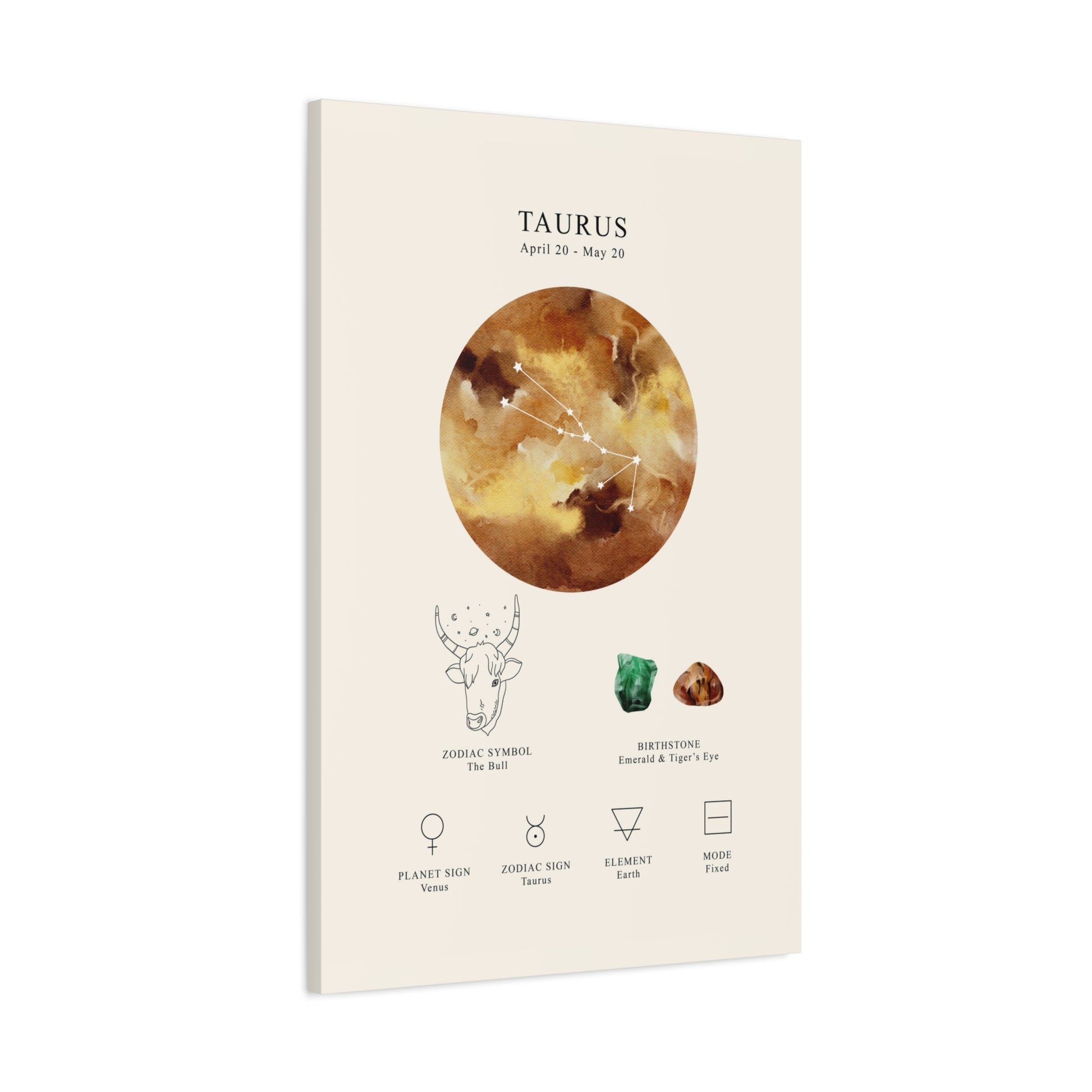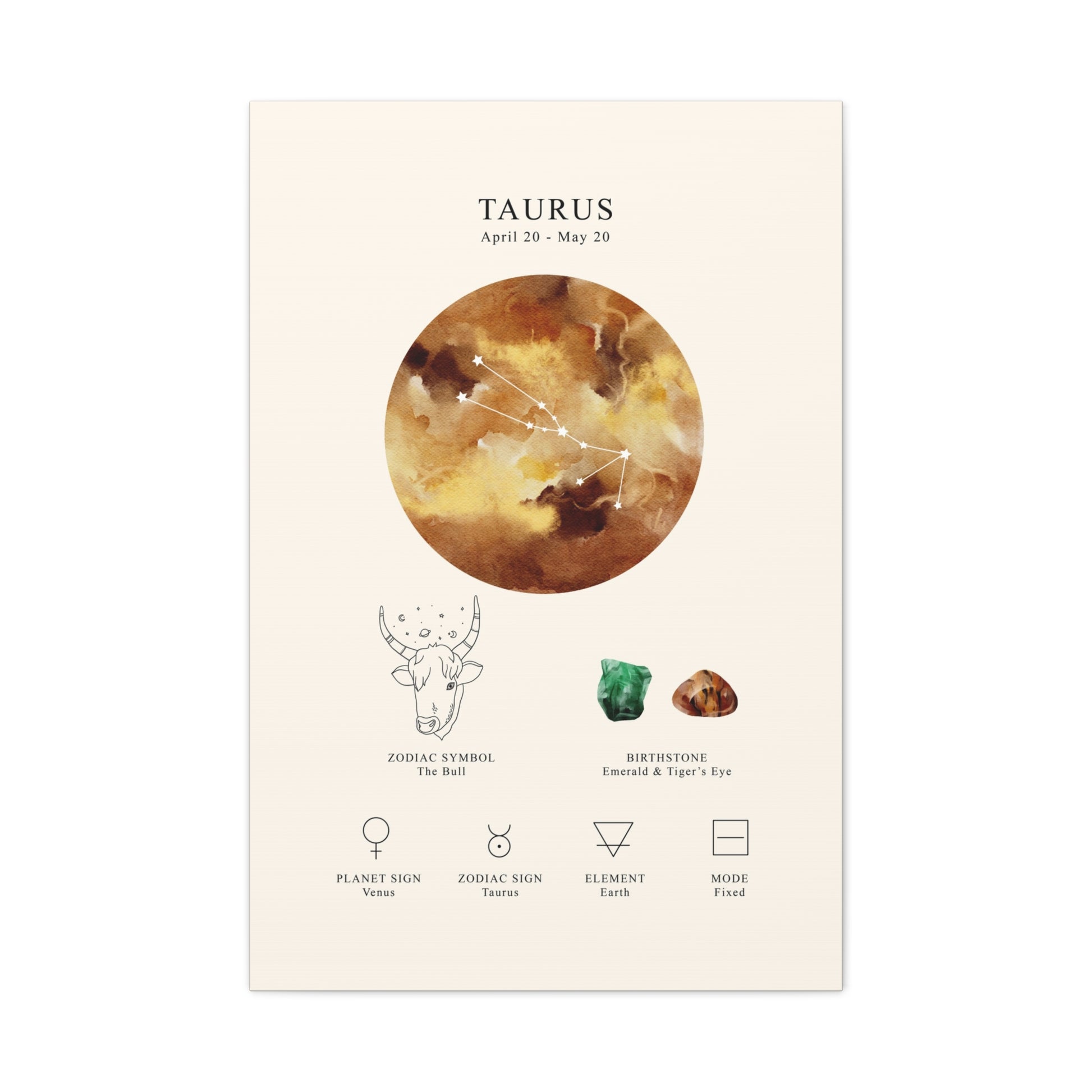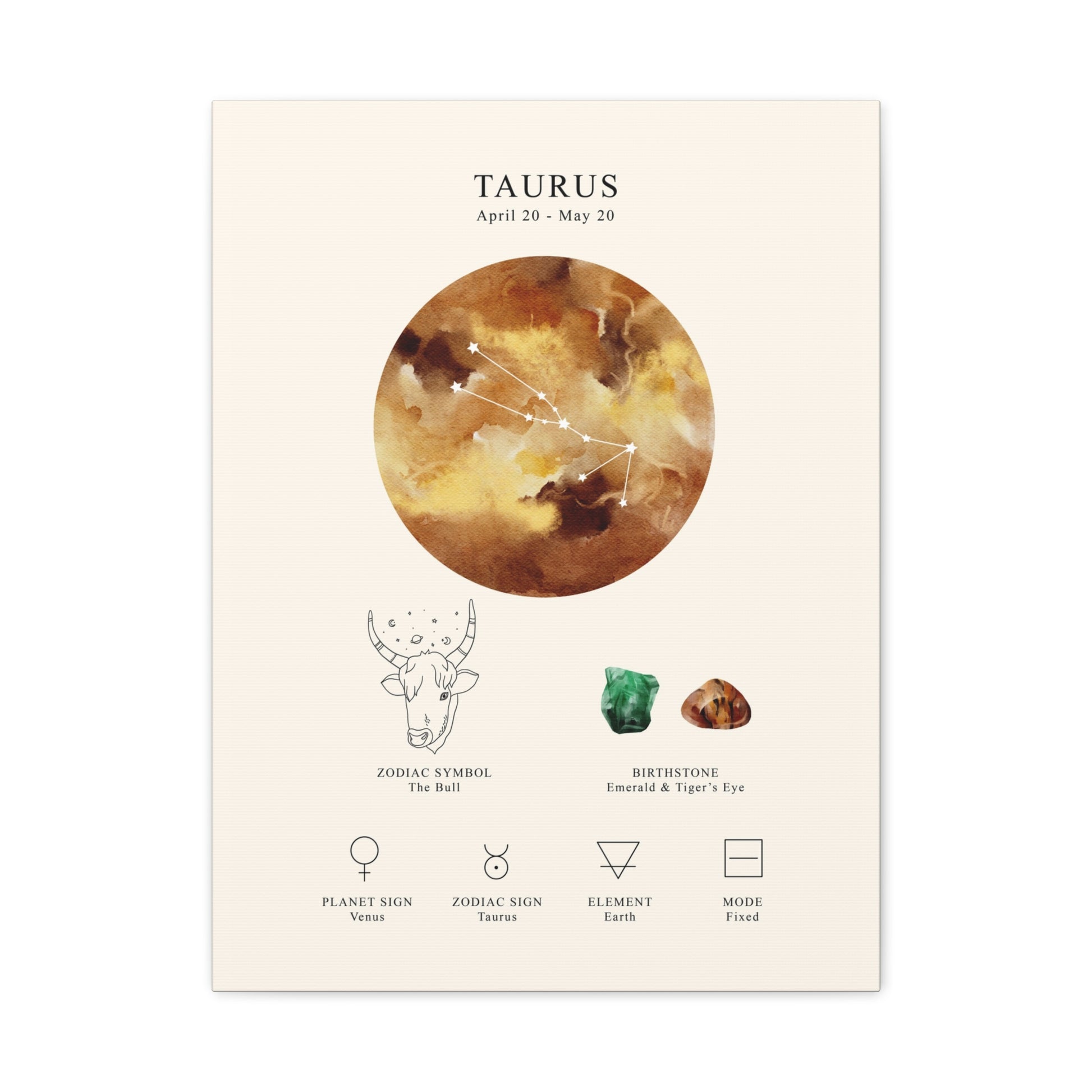 Celebrate the grounded and sensual spirit of Taurus with this celestial zodiac constellation canvas. Featuring the constellation, zodiac name, symbol, birthstone, planet sign, element, and mode, this piece blends astrology with elegant design — a perfect way to honor the Bull (Apr 20 – May 20).